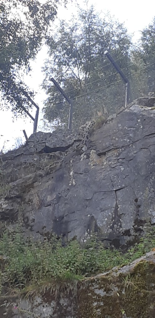 We approached the snow leopard enclousure from the bottom, as their area is on some cliffs to make it as natural to them as possible. There it was, a beautiful male sitting on the ledge above us wriggling his tail. It was hard to take photos as he was a fair bit away.